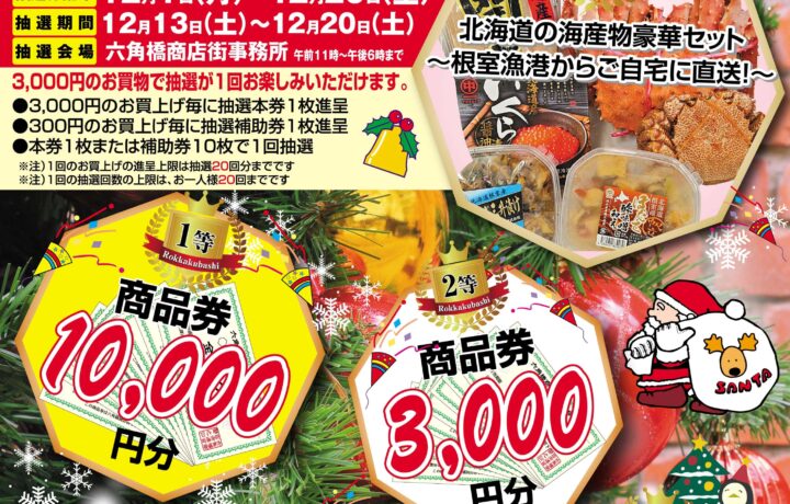 六角橋商店街クリスマスセール参加店をご利用していただきますと、3000円毎にガラポン抽選券本券、300円毎に抽選券補助券を差し上げます。