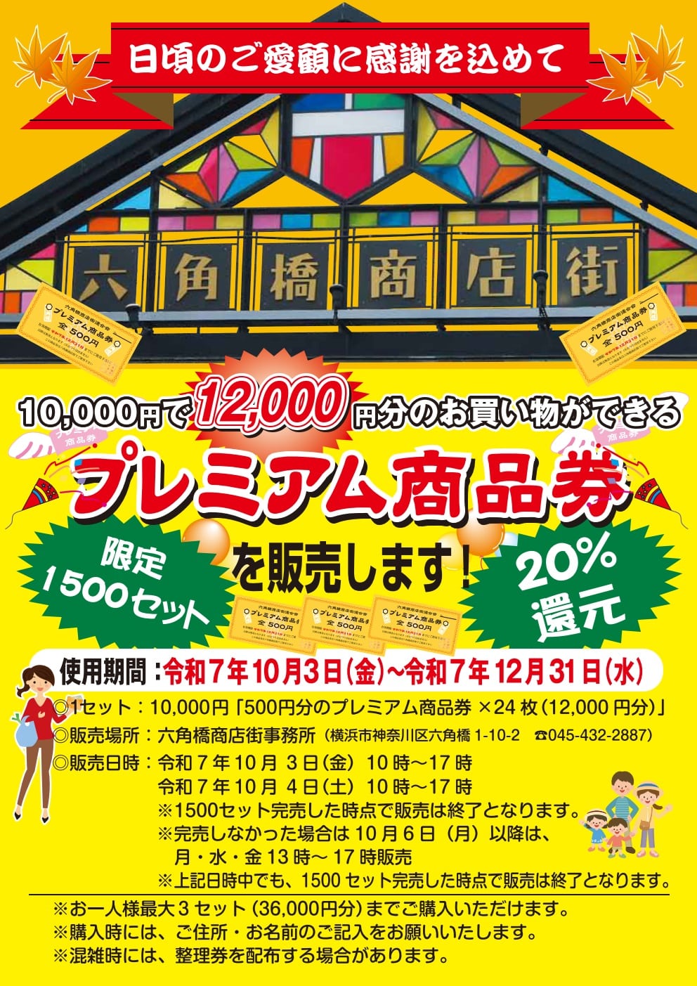 10,000円で12,000円分のお買い物ができる六角橋商店街プレミアム商品券を販売いたします!
